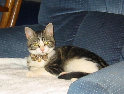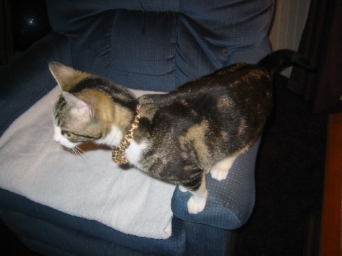 I now have a new "baby" in my house. She is a short hair female with kind of a tabby coloring. She is a young kitten probably between 3-6 months old and came as a stray to Sheila's (the gal who brought the cat to me). She is completely checking out the house and meowing a lot all the way. Of course, she is very curious but that is to be expected. She is scared to death of the floor furnace vents and stays completely away from them. Every time the furnace comes on, she jumps as if something is going to harm her. I think she is looking for her "mother", Sheila, but she has left. She has a very pretty face and I can tell she is young. She started purring now when I pet her, which is a good sign. Trying to take a picture of a kitten before it moves its head is really hard but here are two of my new baby "Bella". I sat down in the living room chair to read at 12:30 so she decided she would take a nap in the other chair that I had already put a towel in for her to cuddle up in. She had been so busy since she got here at 10:00 that she had to be tired but the phone rang a little after 1 p.m. and she was up immediately - just like a baby. She kept meowing at me and as soon as I moved, she moved and then followed me. She sure is a cute cat and I'm sure I will get lots of enjoyment out of her. When I went to the living room earlier, I took her ball with me but as I'm sitting here, she came back in the bedroom with the ball in her mouth as she likes to play with it in the bathroom, probably because it rolls easier in there. I will say, she will probably give me no end of laughs. Sheila must have trained her good when it comes to the table and counters because she's never tried once to get up on either. |