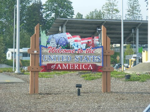 | Just one last e-mail related to our trip to Bowser, B.C. -- We are home safe and sound. We left Anderson, Ca this morning at 6 A.M. looking at a 660 mile run to home. We simply kept coming South with all due haste and made it home at 5:05 P.M. today. No traffic, no close calls, no fighting, and no tomato throwing at the driver !!!! In all it was a very nice trip. We went 3,097 miles mainly in 4 days of driving. Two going up and two coming back. With three drivers it was not too bad. I have attached a final picture that says it all whenever I am out of the country and come back. This was taken at the Blaine Wa. crossing point into the U.S. Normally we cross at the Peace Arch crossing but Sat. morning there was lots of "Hold" time so we went to the truck crossing a few miles away. They do not like cars to cross there but there is no law against it and its tons faster if there is a slow down at the main crossing.