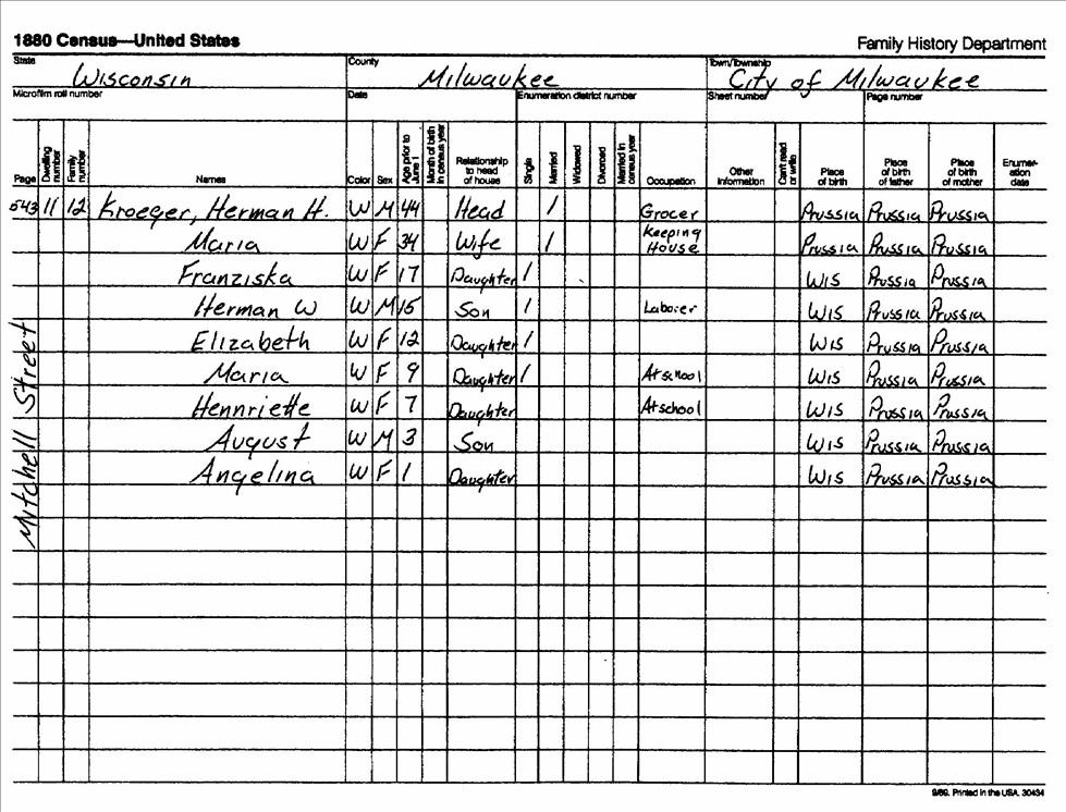 1880 Federal Census For Herman Kroeger