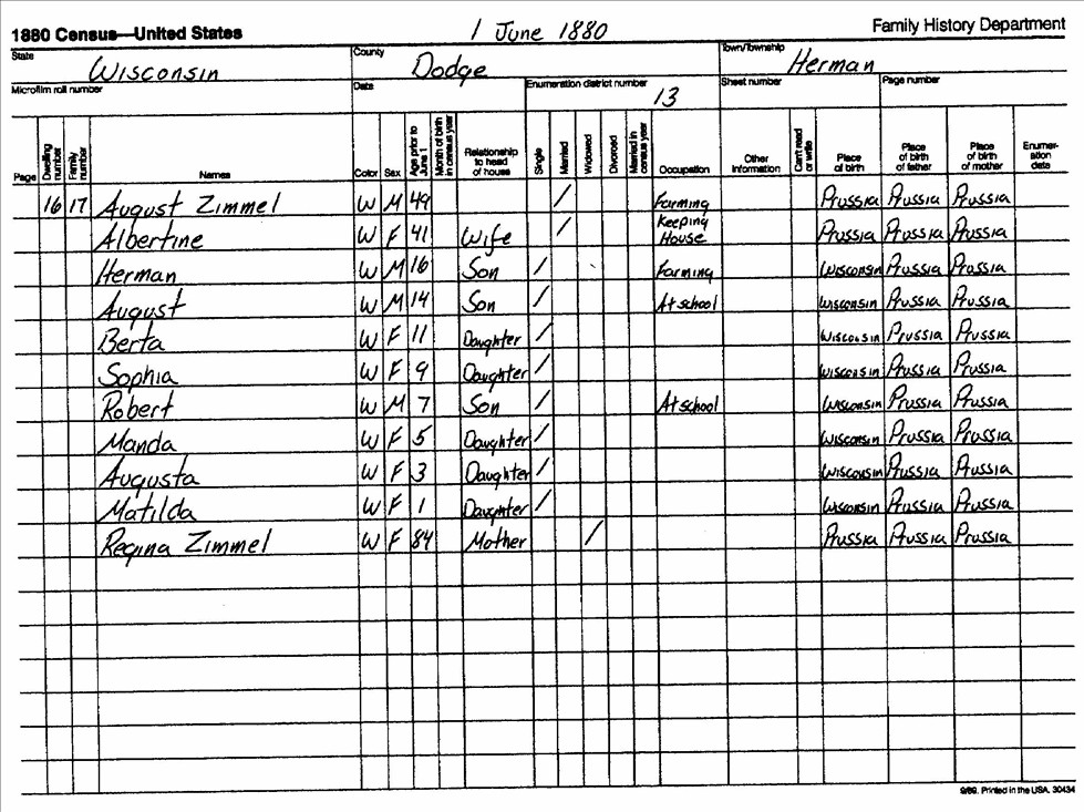 1880 Federal Census For August Zimmel