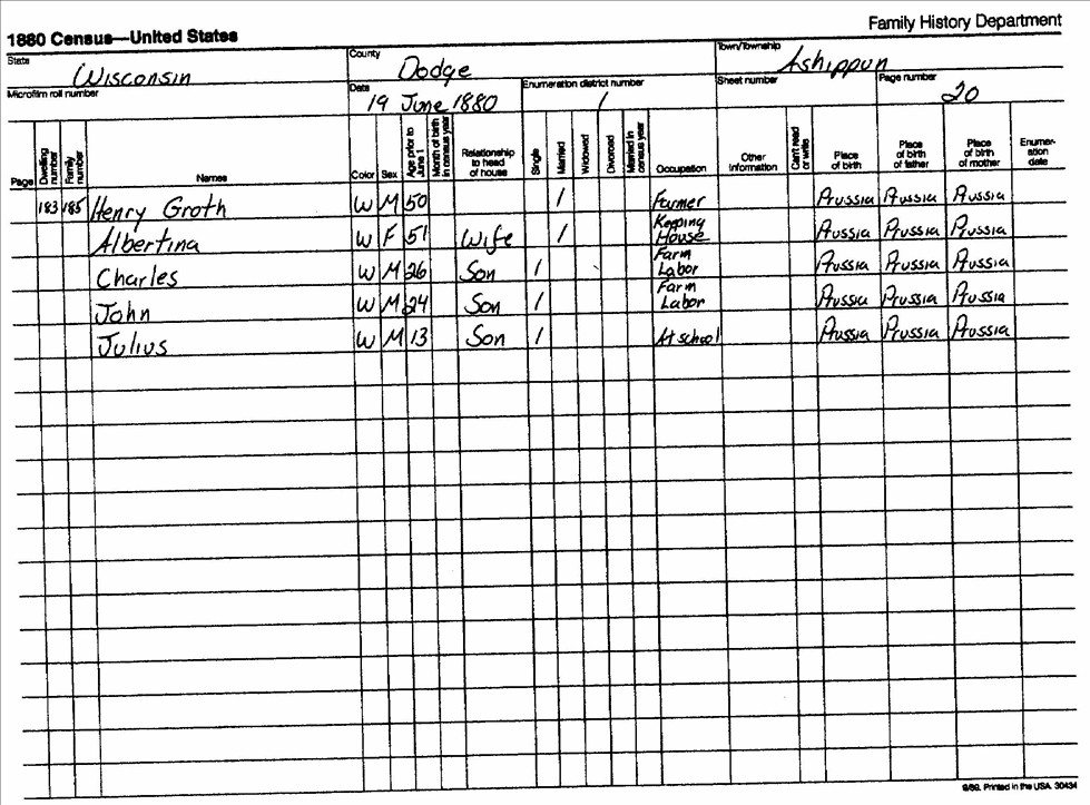 1880 Federal Census For Henry Groth